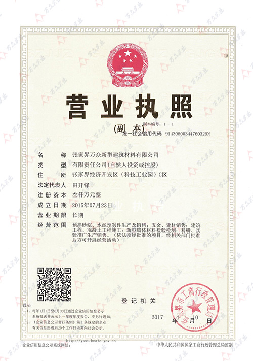 2017-2018 © Copyright. All Rights Reserved 張家界萬眾新型建筑材料有限公司 版權(quán)所有 營業(yè)執(zhí)照查詢 湘ICP備17022854號-1